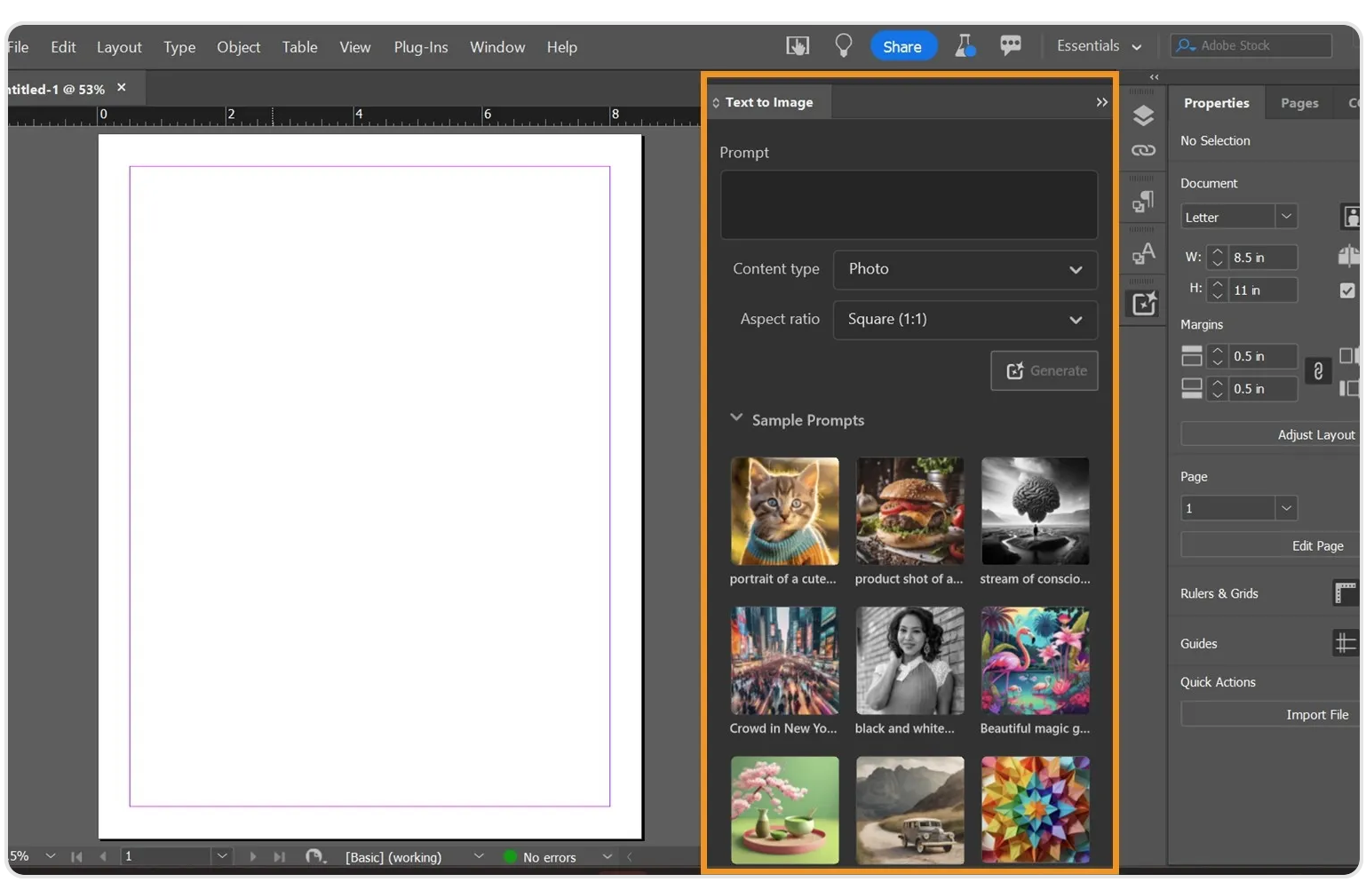 Another exciting development showcased is the introduction of generative AI within InDesign. This enhancement comes in the form of the new ‘Text to Image’ feature, which allows users to create stunning images from simple text prompts directly within the app.