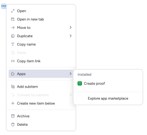 From monday.com, you can create proofs directly from the item or subitem’s view (file attachments, monday.com file, email, or website URL). The latest feature release offers a new way to create a proof – open the Board Item Menu (click the 3 dots icon next to the item) and select apps, then create proof.