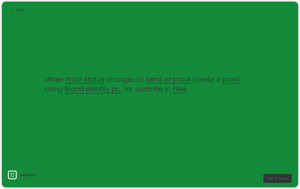 Learn how to automate sending proofs in this help article, or contact one of our team via the in-app chat on your PageProof dashboard for assistance with setting up this integration recipe on your monday.com board. Seamlessly create proofs in a click.