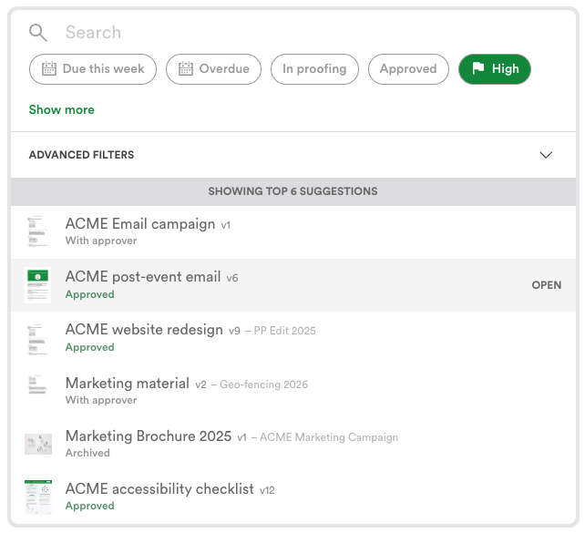 Global search is available wherever you are in PageProof. Simply type / on your keyboard to apply quick filters, or use advanced filters to refine results further.